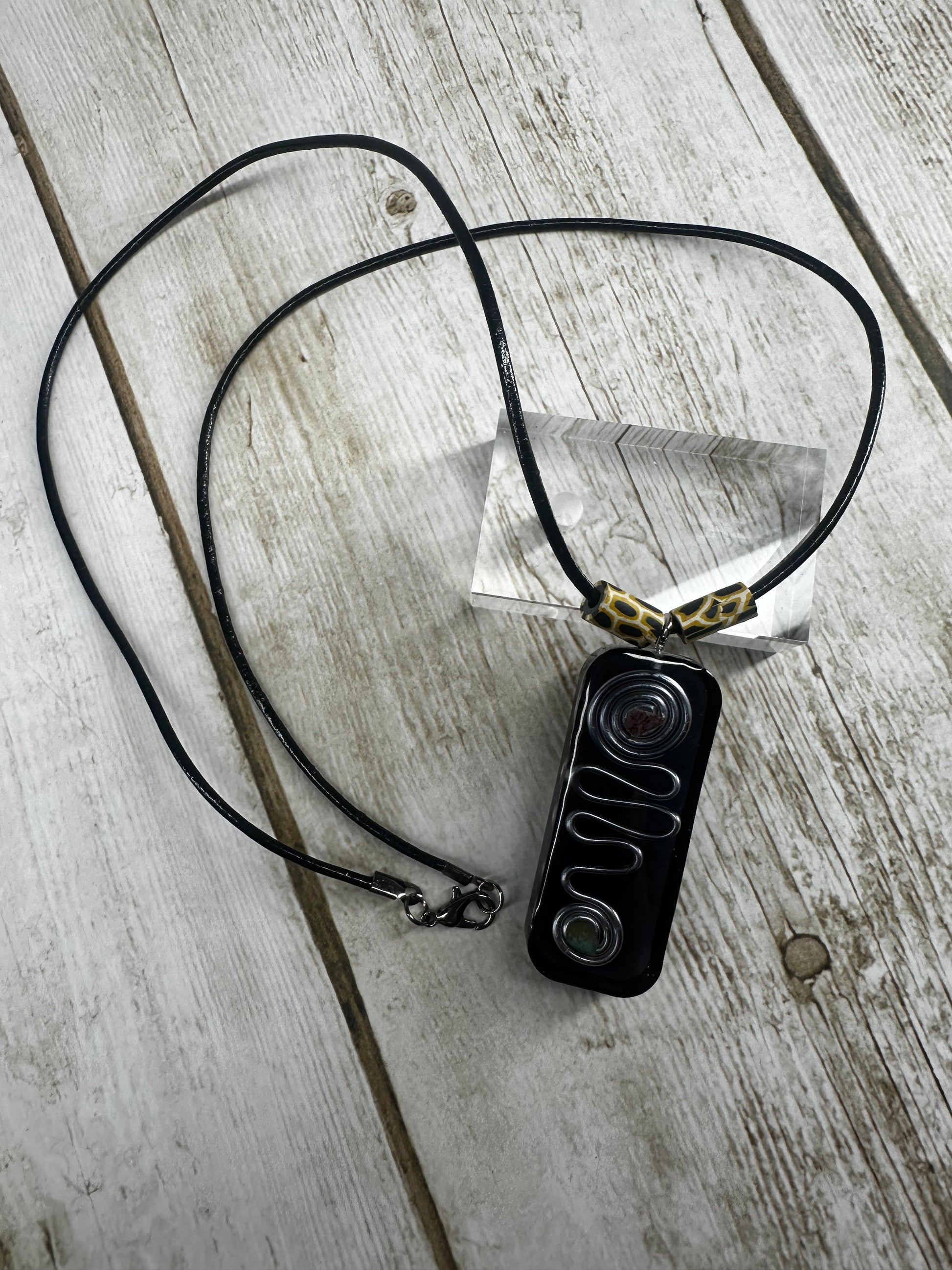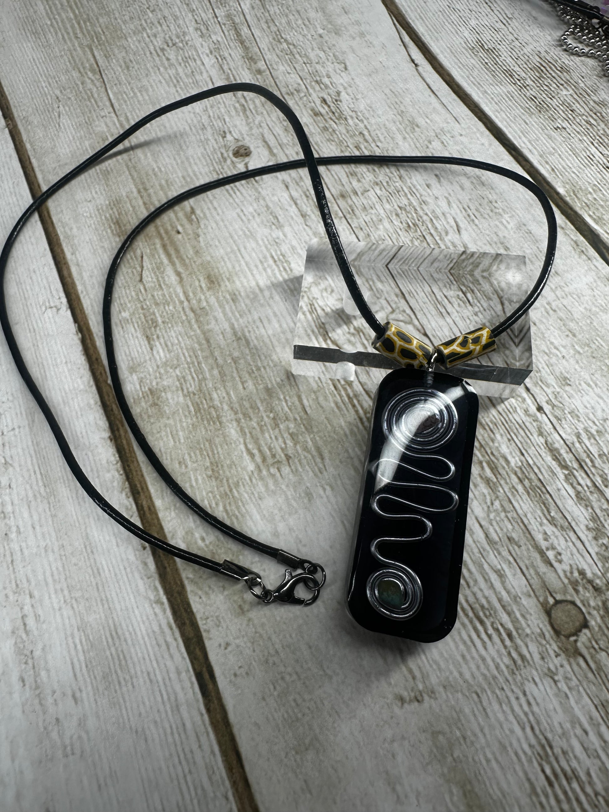 Add a touch of whimsy to any outfit with our Doodle Pendant Necklace! Made with a resin pendant and metal doodle accents inside, this necklace is sure to turn heads. The 24-inch leather cord allows for versatile styling options. Perfect for those who don't take themselves too seriously!