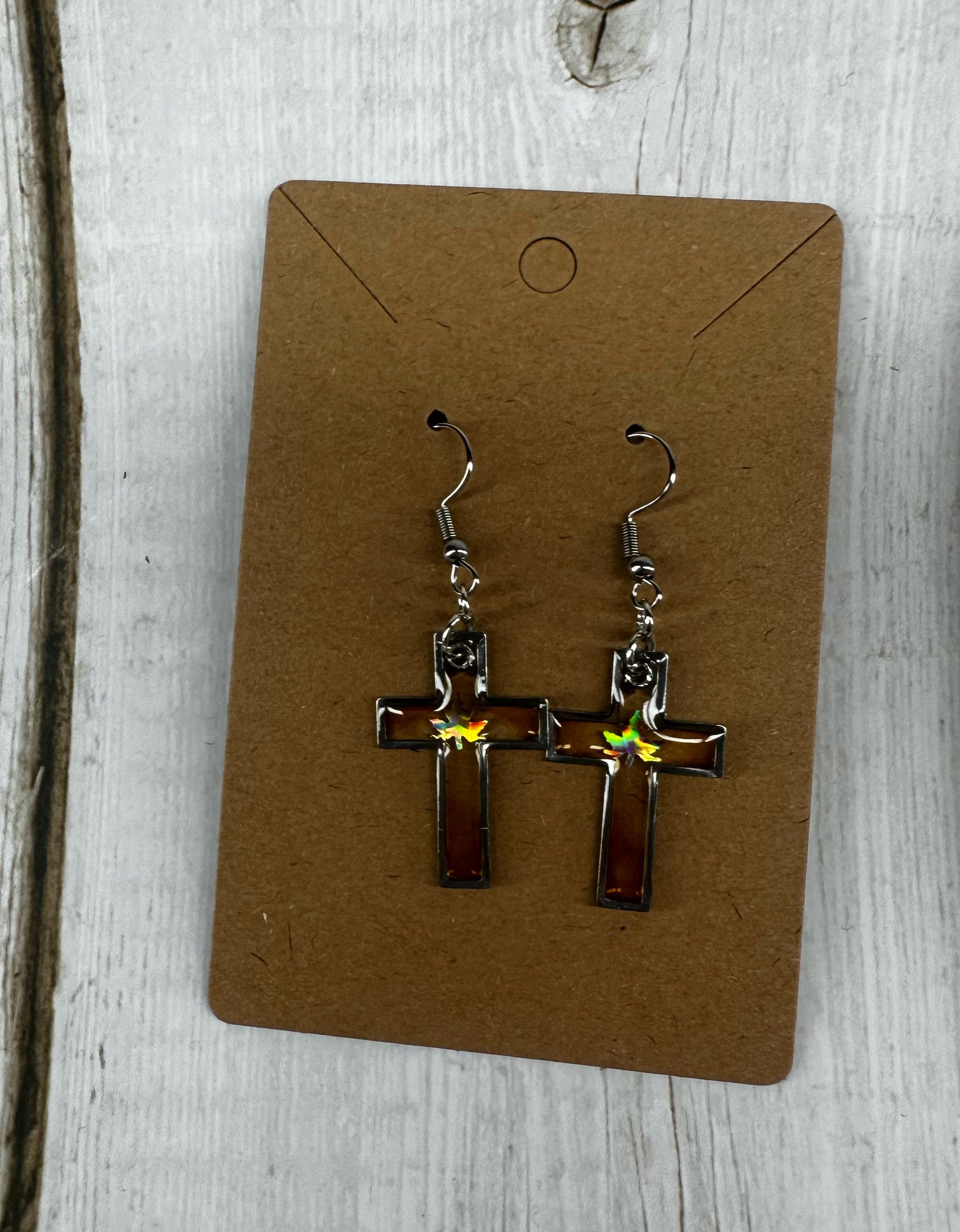 Expertly crafted for the fashionable fall season, our Fall Cross Earrings feature a hypoallergenic and nickel-free design for sensitive ears. The cross shape allows light to shine through, revealing a stunning holographic leaf detail. Elevate your autumn wardrobe with these unique and stylish earrings.