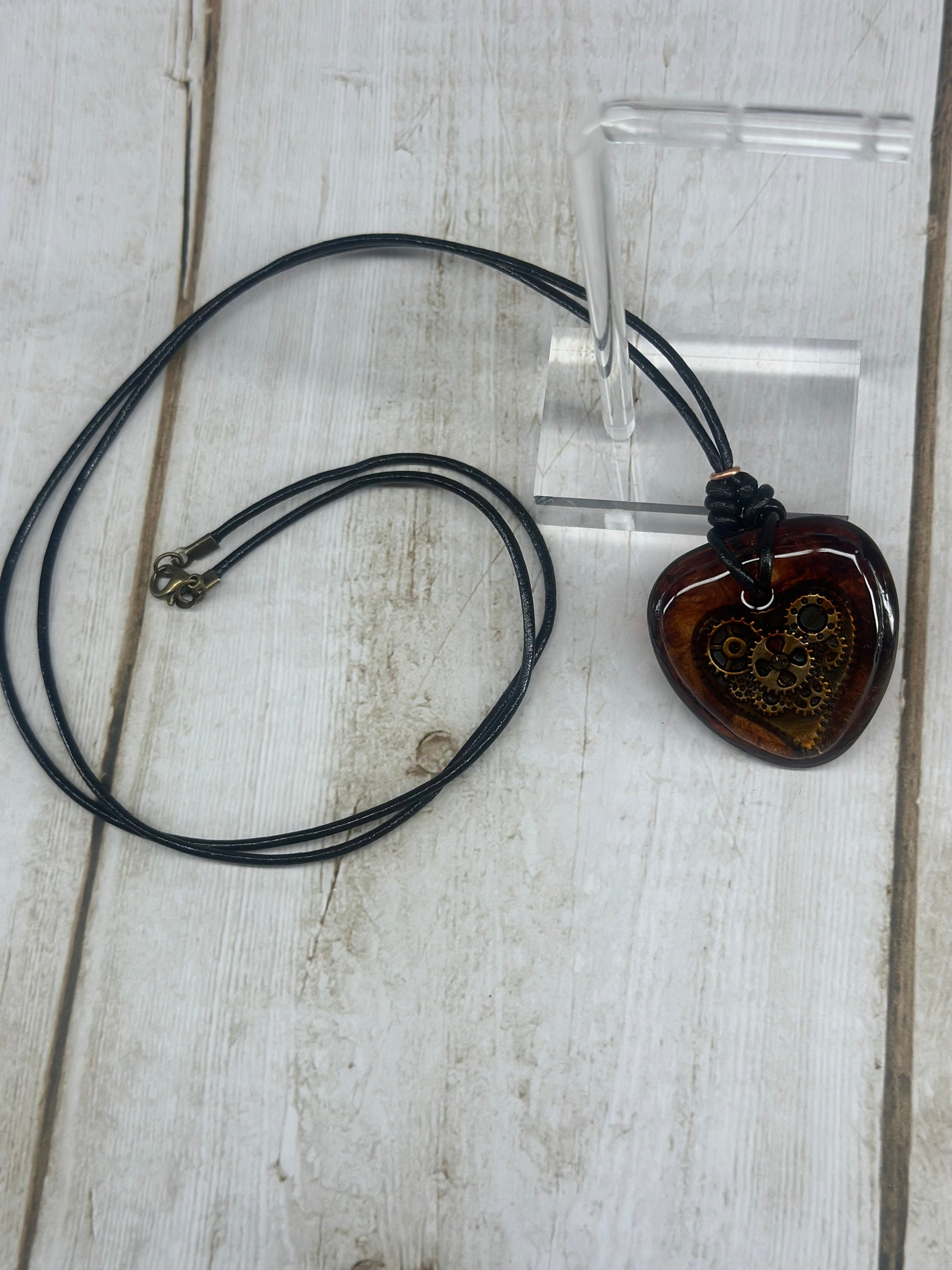"Unleash your bohemian spirit with our Rustic Pendant Necklace. Handcrafted with resin and adorned with faux mechanical accents, this 32-inch necklace is the perfect blend of edgy and elegant. Make a statement with this one-of-a-kind piece. (It's resin-able, get it?)"